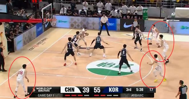 第三节中国队落后韩国队多达16分,此时的郭士强依旧还是不敢放手一搏,还是迷信主打内线,想用周琦或者胡金秋的高度去帮助球队打开局面,这么干一两个回合是可以,但要全场比赛都这么打,反而是一种自废武功,只见周琦一人持球,中国队外线四人全都定住不动,队友们既没有跑位也没有穿插到篮下策应,面对韩国队的包夹,周琦也第一时间也没有将球转移给弧顶大空位的张镇麟,而是愣了几秒后才开始动身往里凿,在周琦看来,他可能是不信任张镇麟,也可能是在听话执行郭士强给他的低位任务,不得不完成。